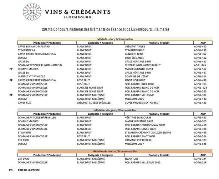 Le Crémant de Luxembourg reflète parfaitement la quête de qualité que les viticulteurs luxembourgeois maîtrisent. Le procès complexe nécessaire à l’élaboration du Crémant est particulièrement important pour les vignerons. La popularité du Crémant sur le marché du vin luxembourgeois est également démontrée par le fait que 3,5 millions de bouteilles de Crémant sont désormais produites, par rapport à 2,1 millions de bouteilles en 2010. Il était également clair pour les jurés que ce produit, qui se caractérise par la joie, la convivialité et l’élégance, mérite des récompenses. Au total, les Crémants de Luxembourg ont pu remporter 16 médailles d’or, 8 d’argent et 2 de bronze.